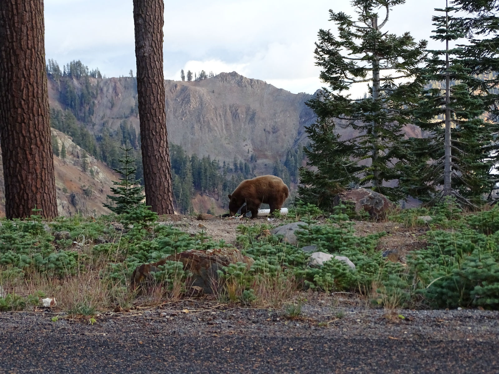 Und wir haben das große Glück, einen wilden Bären zu beobachten, der sich am Straßenrand über Müll hermacht, den Touristen liegen gelassen haben. Wahnsinn, der Bär ist keine 20 Meter von uns entfernt! Erstaunlich ist, dass sich der Bär, immer wenn er ein Motorengeräusch hört, versteckt und erst wieder raus kommt, wenn das Auto vorbeigefahren ist. Schlauer Bär! 🙂