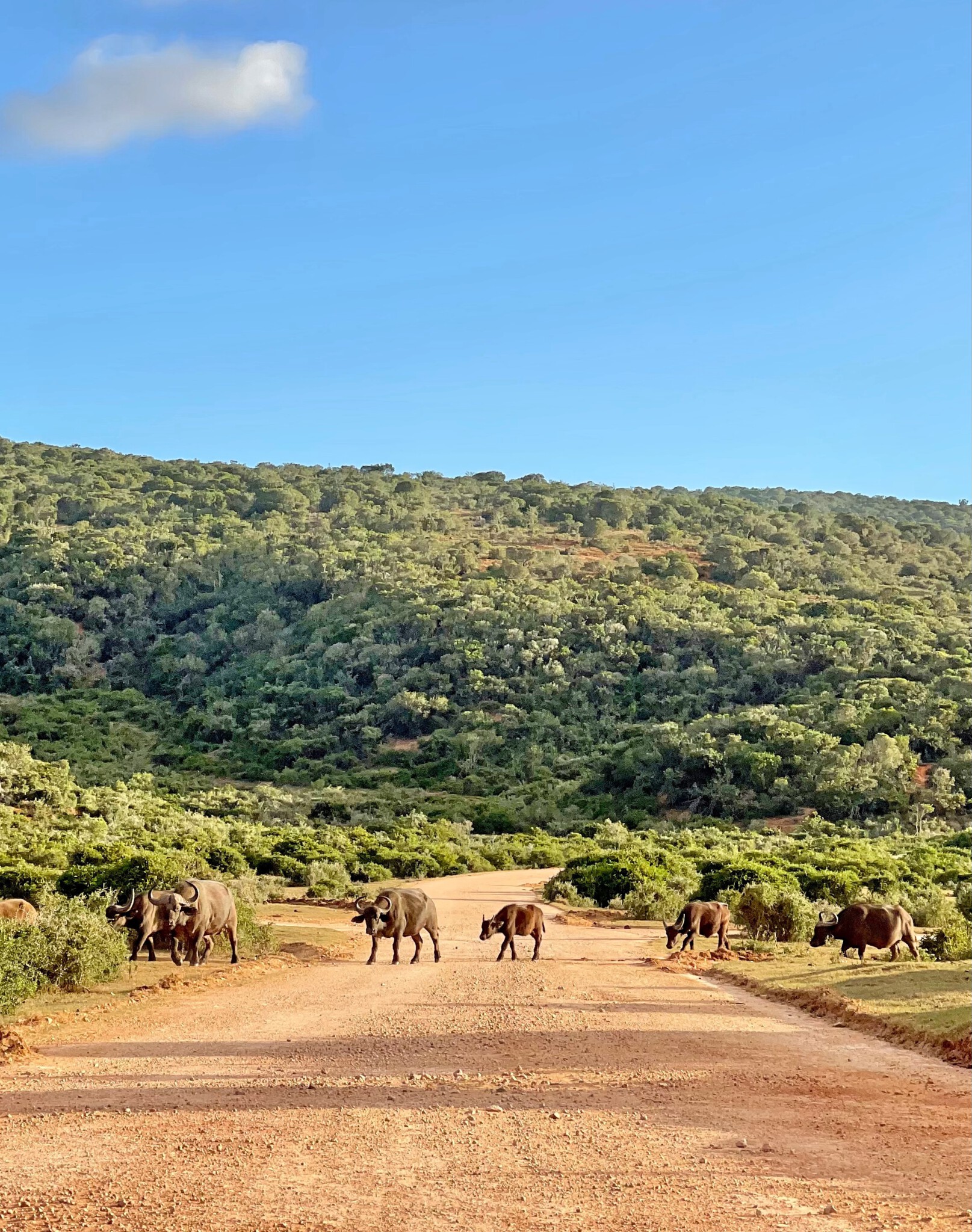 Am dem Rückweg kreuzt eine Büffelherde mit Jungtier unseren Weg. Im Camp angekommen, gönnen wir uns ein kühles Savanna auf der Terrasse. So endet unser ereignisreicher Tag im Park.