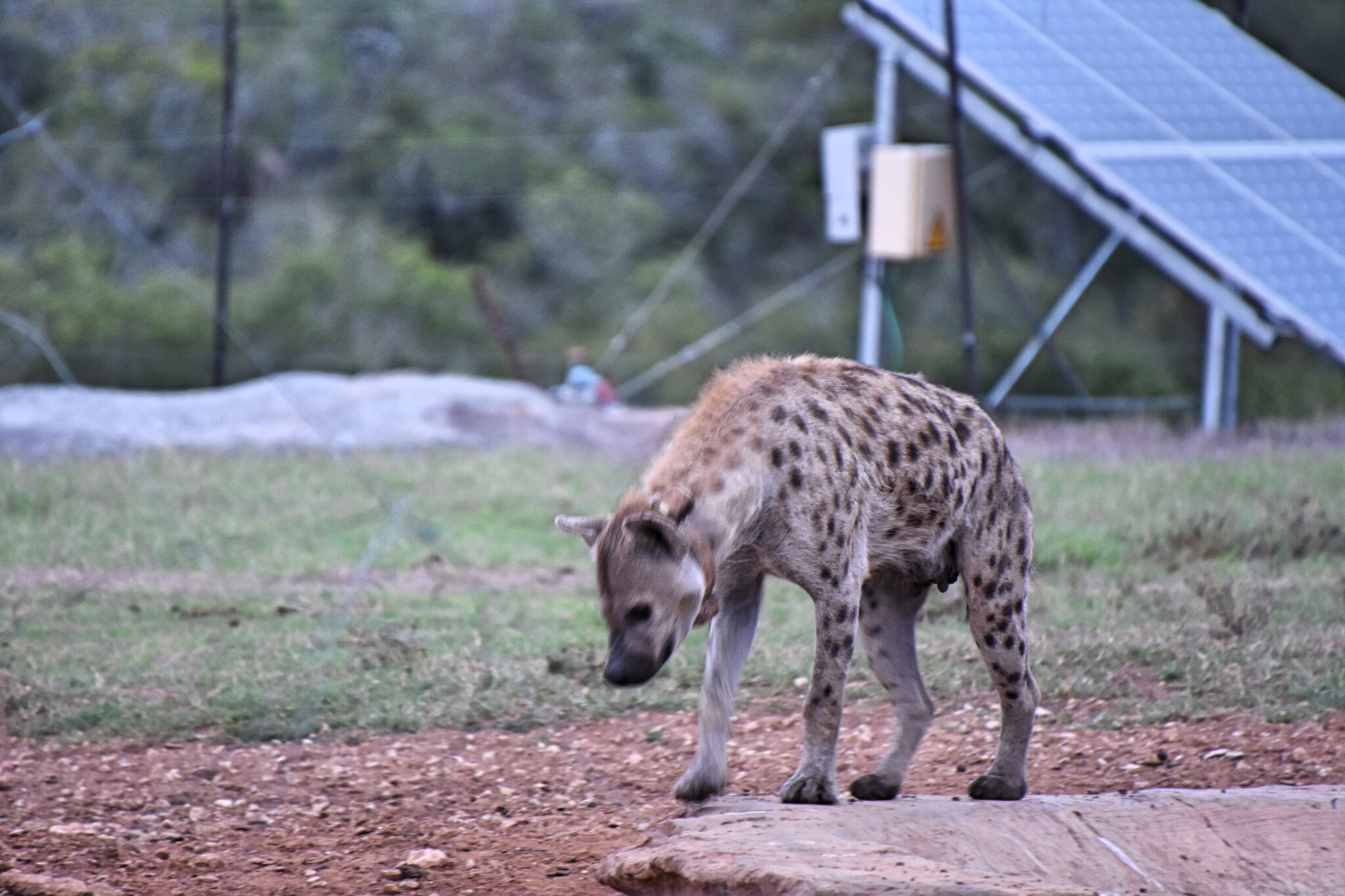 Wir steuern die Wasserlöcher an und haben großes Glück. Dort treffen wir tatsächlich auf eine Hyäne, die gerade trinkt. Es ist nur ein kurzer Moment, denn sie hält sich hier nicht lange auf und sucht ganz schnell das Weite. Das Bild ist leider nicht so gut, aber das frühe Aufstehen hat sich auf jeden Fall gelohnt!