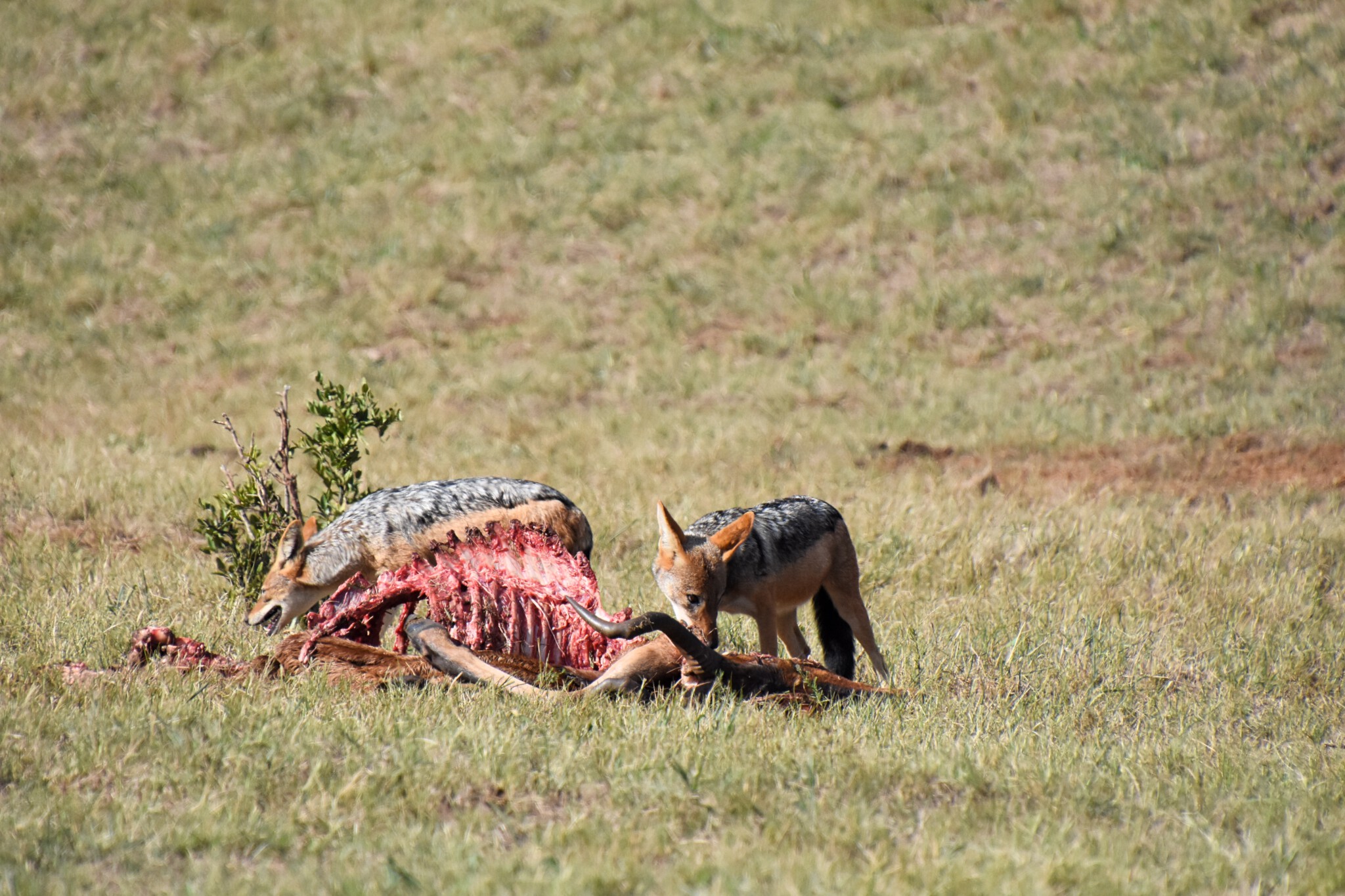 Wir steuern direkt die 3 Löwen vom Vortag an. Die sind tatsächlich weitergezogen und haben in der Nacht ein Red Hartebeest gerissen. Offensichtlich haben sie sich satt gefressen, denn sie haben nichts dagegen, dass die Schakale sich jetzt über den Kadaver hermachen.