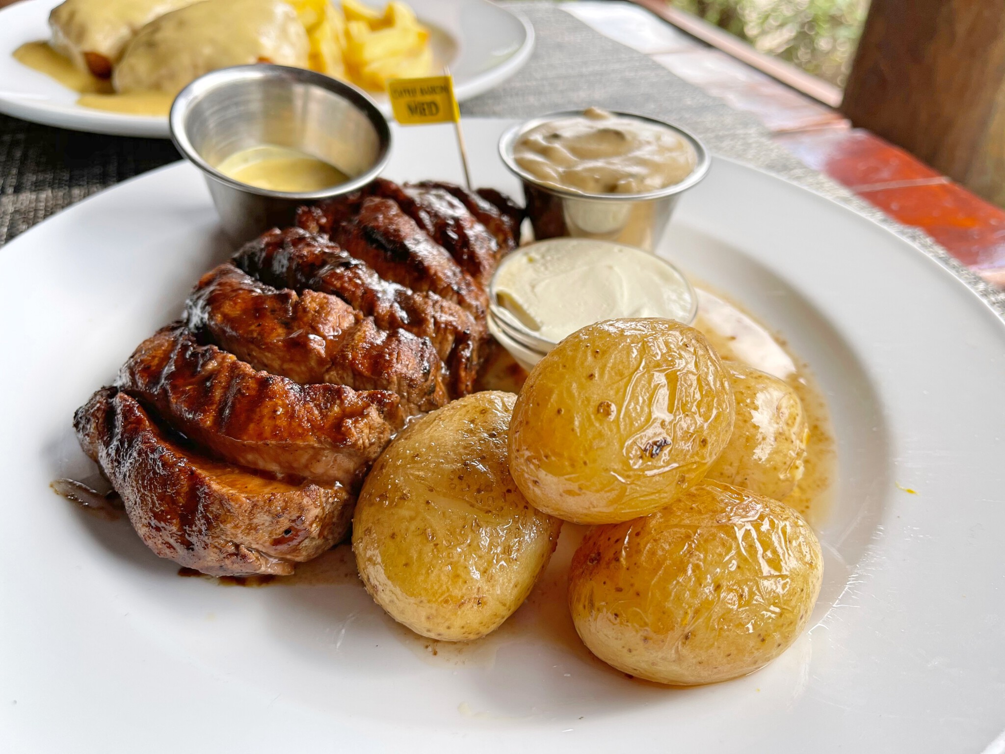 Wir fahren zum Mittagessen ins Main Camp. Hier gibt es ein Cattle Baron Restaurant. Die Steakhouse-Kette besuchen wir in Kapstadt oft. Wir lassen uns ein köstliches Chateaubriand schmecken.