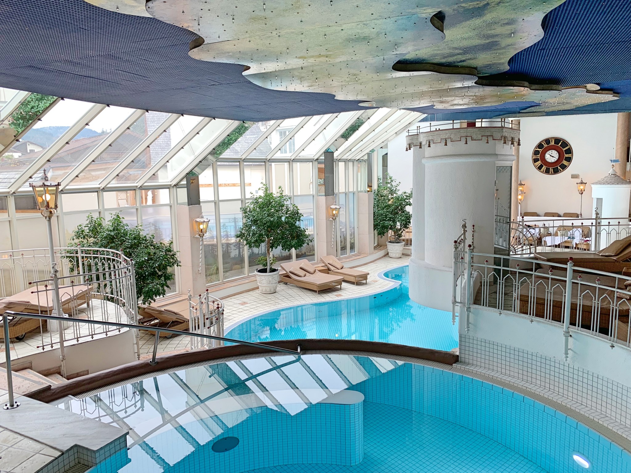 Überall im Spa-Bereich findet man gemütliche Liegeflächen. Mein Lieblingsplatz sind die Schaukeln in der großen Sonnenhalle mit Blick auf die Berge. Was gibt es Schöneres, als an einem verregneten Herbsttag in der wohligen Wärme nach draußen auf die gefärbten Bäume zu blicken.