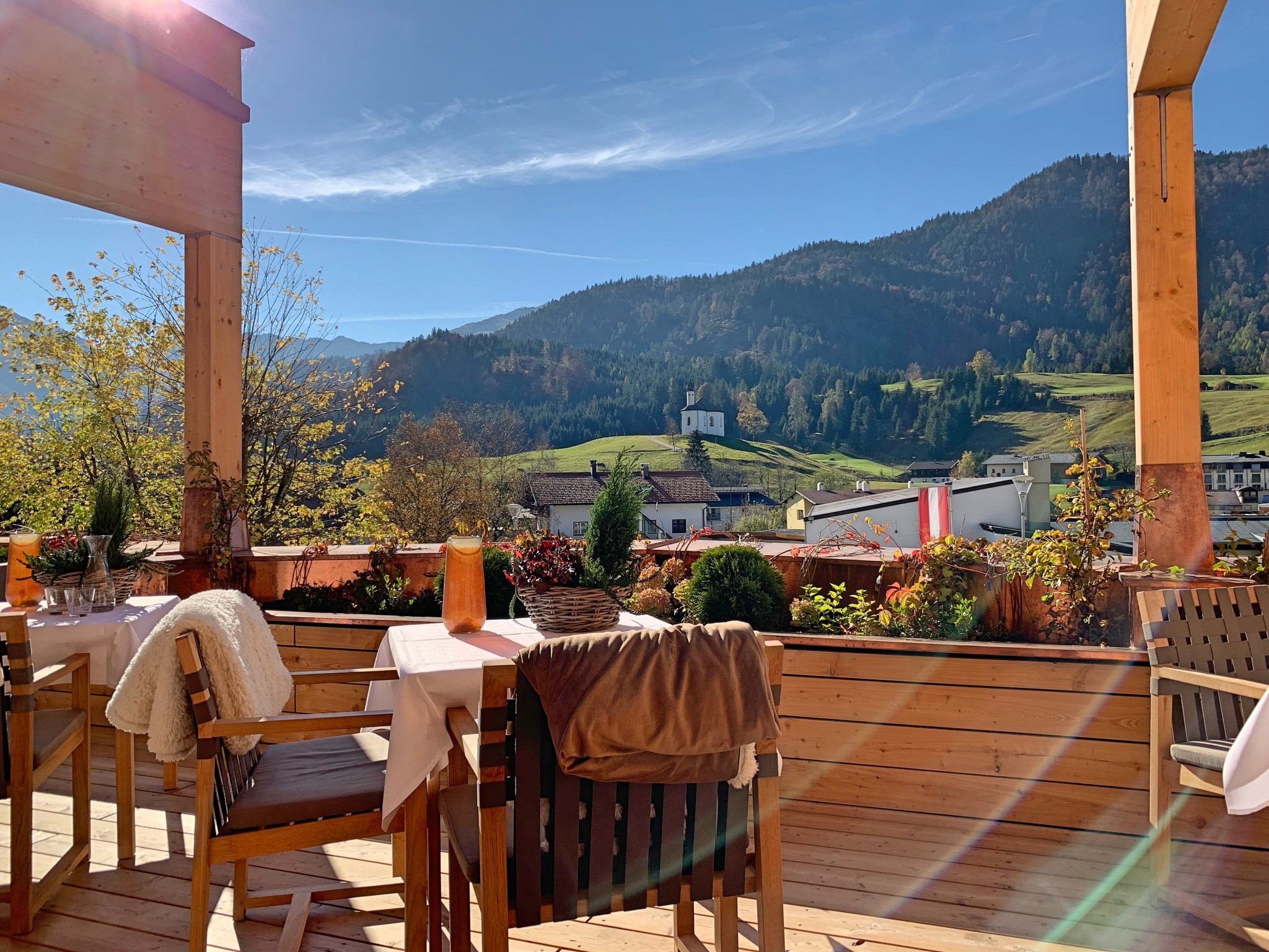 Unser Aufenthalt beginnt mit einem Cappuccino auf der Terrasse, wo wir mit Blick auf die umliegenden Berge die letzten Sonnenstrahlen des goldenen Herbstes aufsaugen. Herrlich!