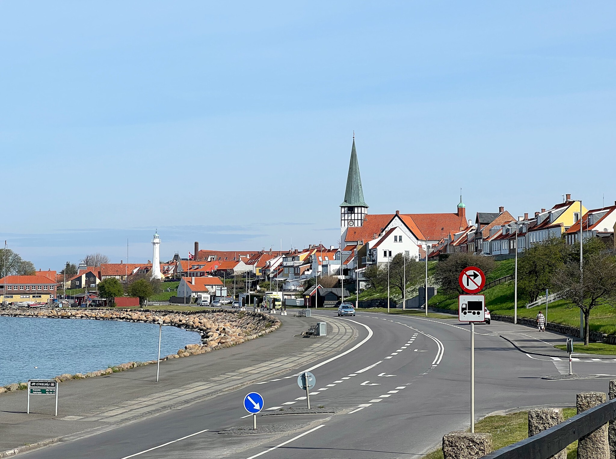Mit etwas Verspätung legen wir im Hafen an. Es werden kostenlose Shuttlebusse in die Innenstadt angeboten. Wir stellen uns nicht an, sondern entscheiden uns dafür die ca. 1,5 km lange Strecke zu laufen. Der Weg führt immer am Hafen entlang. Nach ca. 20 Minuten könnte man in die Innenstadt abbiegen. Wir folgen allerdings weiter der Hauptstraße und biegen dann in den Nordre Kystvej ein. Dort befindet sich die Fahrradvermietung Bornholms Cykeludlejning. Schon von Zuhause aus haben wir für den heutigen Tag zwei E-Bikes gemietet. Pro Fahrrad zahlen wir 200 Dänische Kronen, umgerechnet etwa 27 Euro pro Rad.