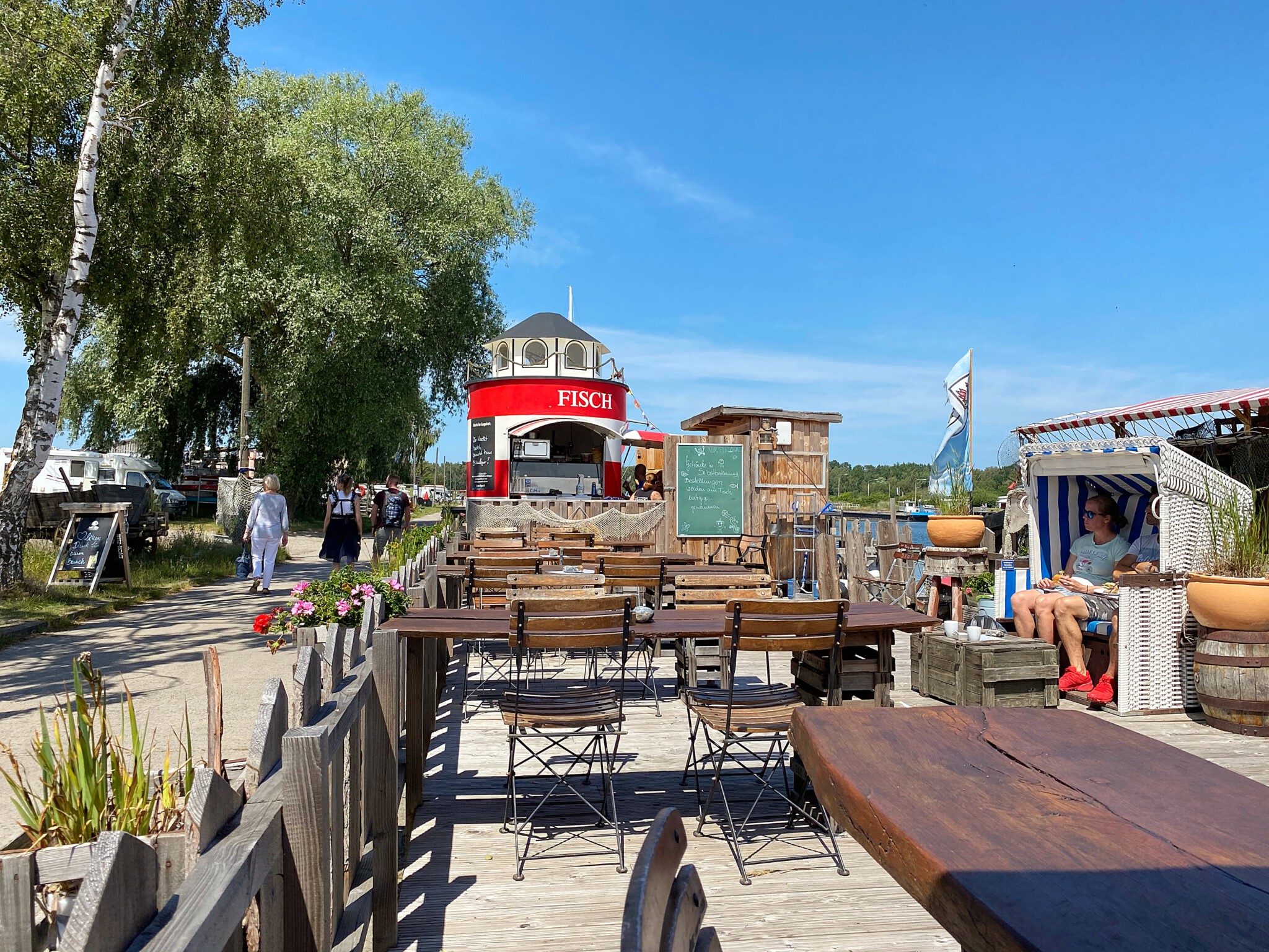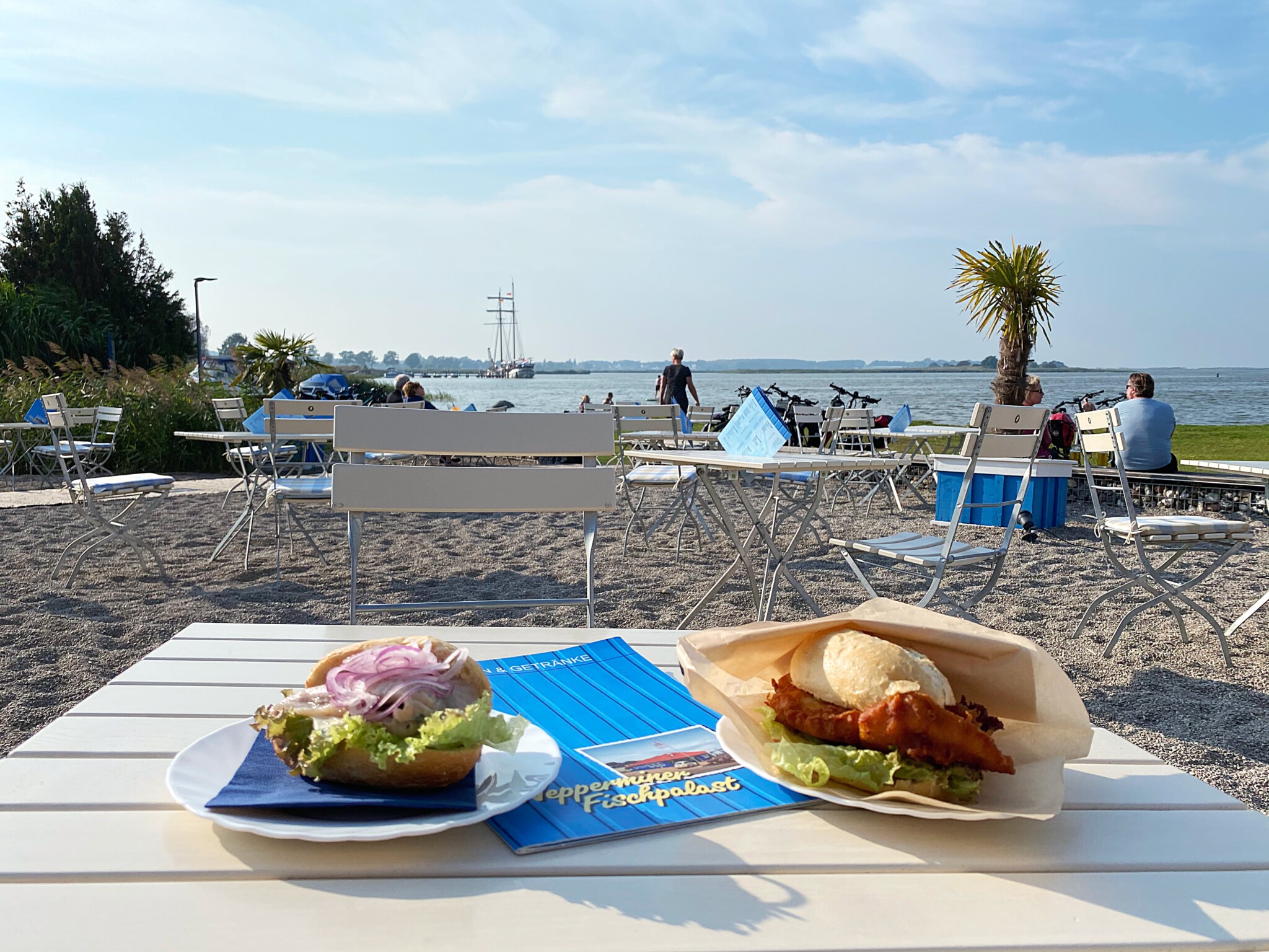 Wir kehren gerne bei der Hafenbar „Zum dünnen Hering“ ein und genießen eins der leckeren Fischgerichte.