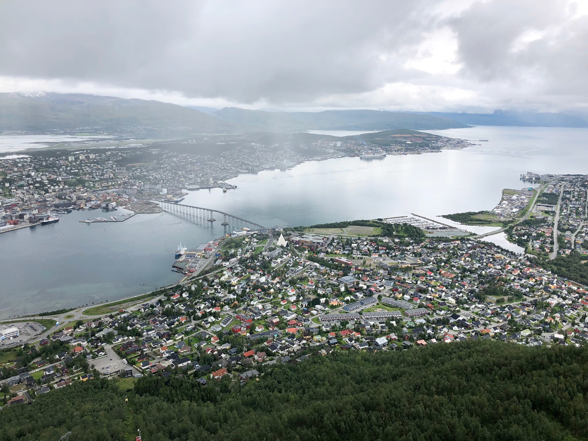 Als erstes laufen wir über die Tromsö-Brücke zur Talstation der Fjellheisen Seilbahn und fahren auf den Hausberg Storstein. Von hier oben hat man einen wunderbaren Blick auf die Stadt.