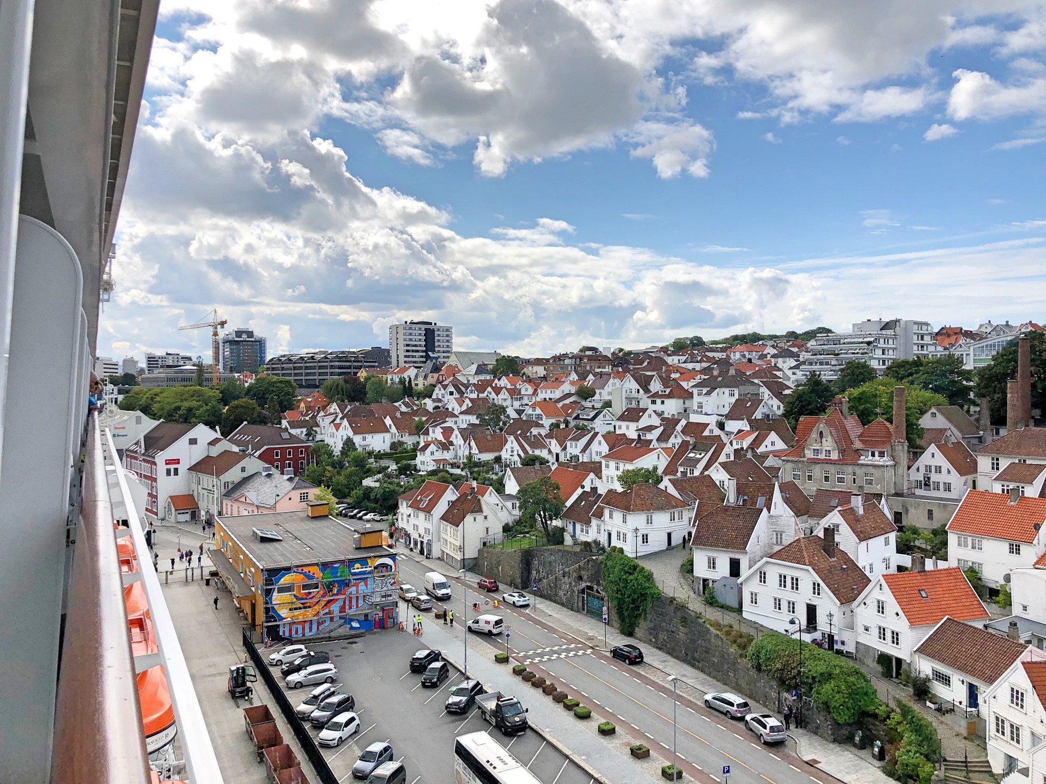 In Stavanger haben wir unseren letzten Landgang. Von unserer Balkonkabine aus blicken wir auf die Altstadt Gamle Stavanger.