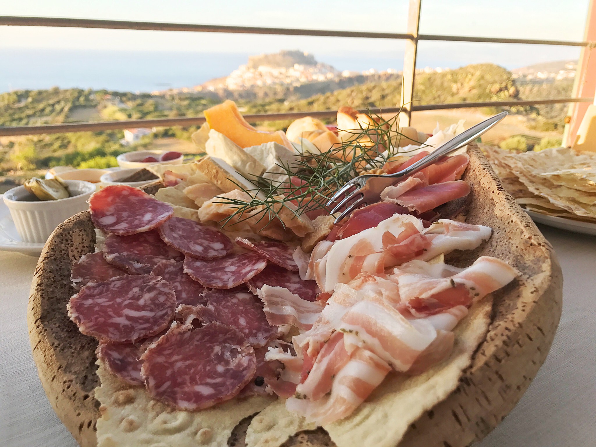 Die Vorspeise bestehend aus köstlichem Pecorino, Schinken, Salami und Melone wird auf einer großen Korkplatte serviert zusammen mit frischem Brot und mit Olivenöl überzogenem Pane Carasau (ein dünnes, sardisches Brot).