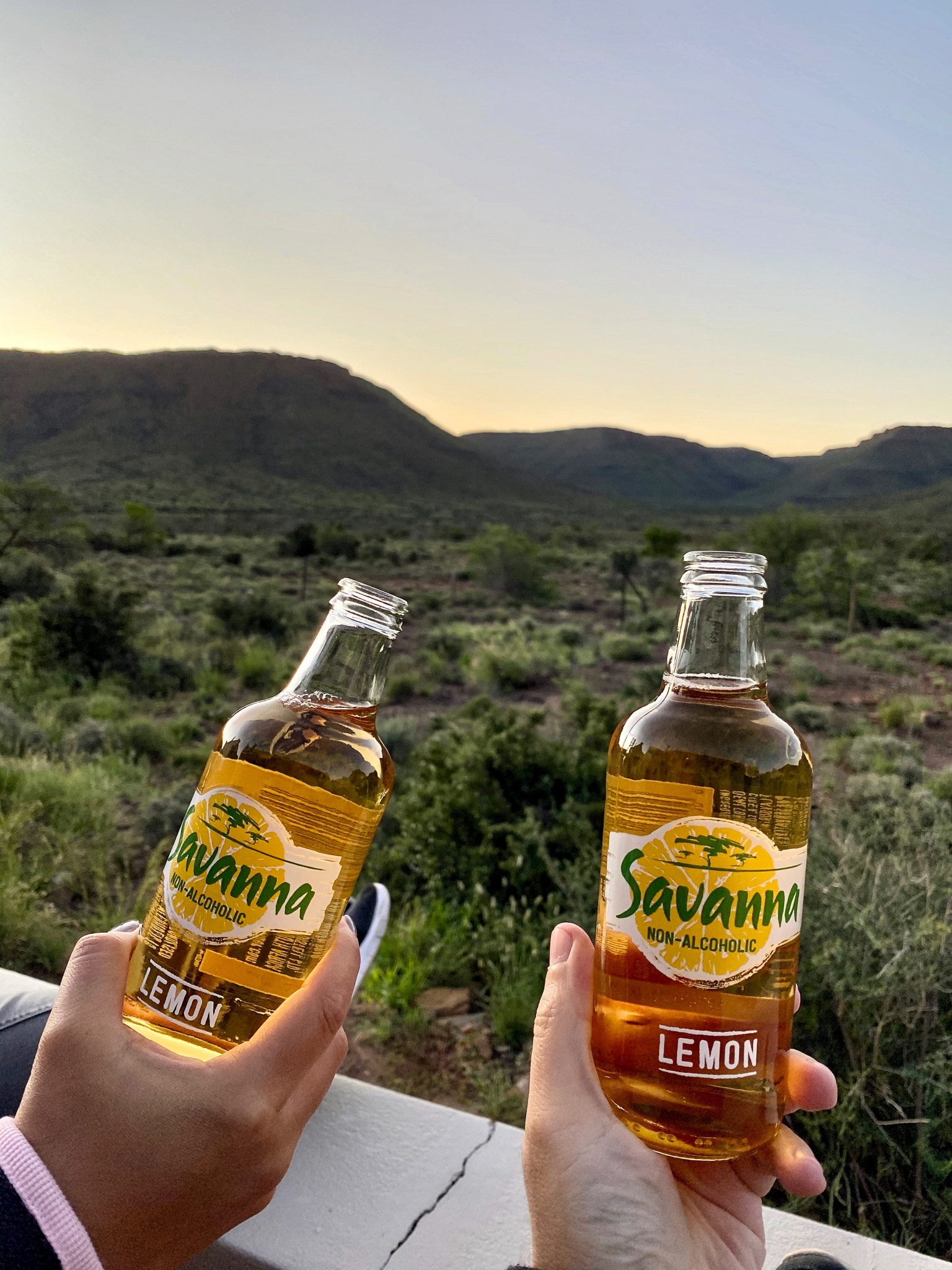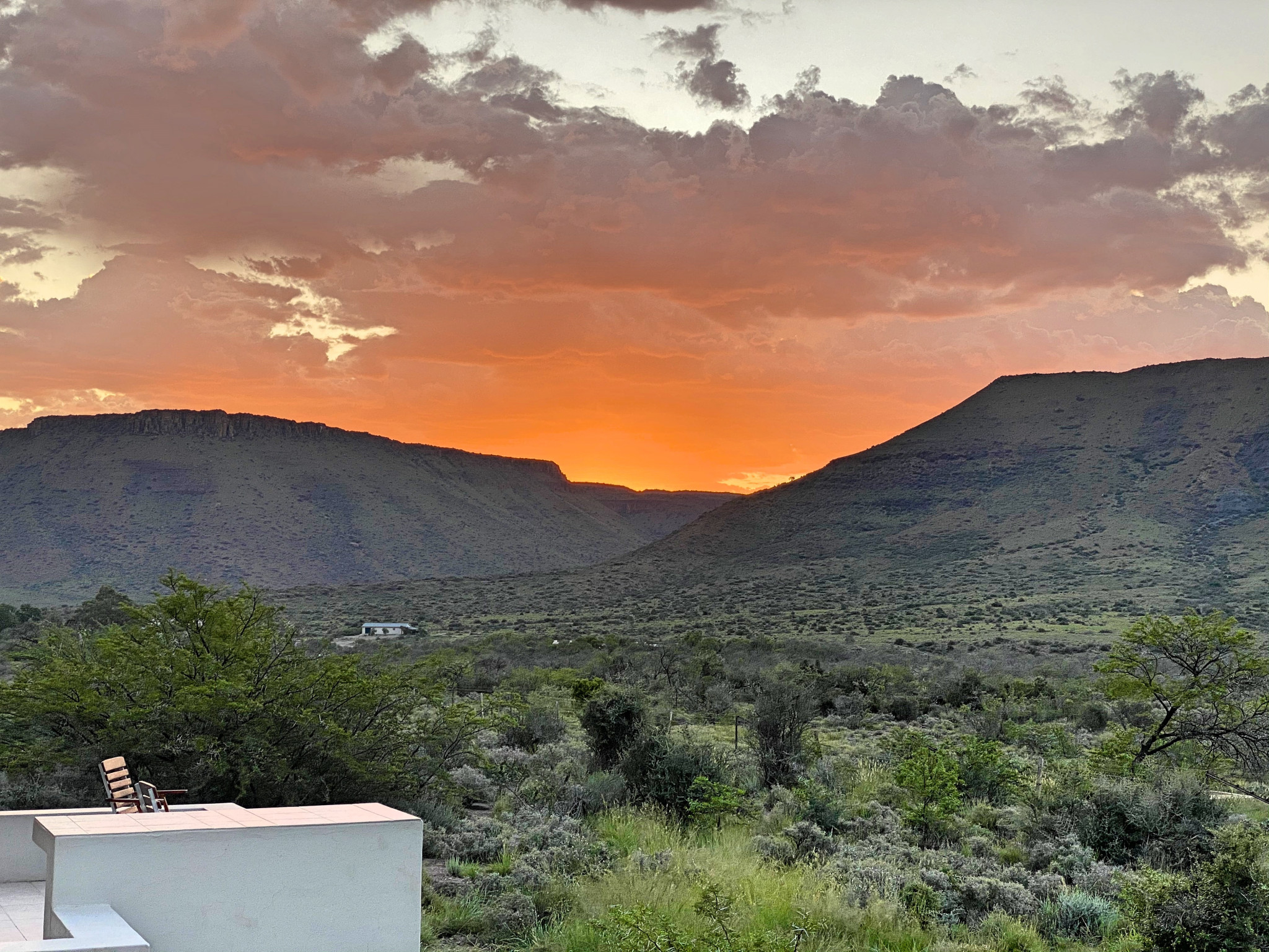 Am ersten Abend genießen wir den Sonnenuntergang auf unserer Terrasse, der von Hyänen-Geschrei begleitet wird. Hier draußen in der Wüste kann man wunderbar Sterne beobachten.